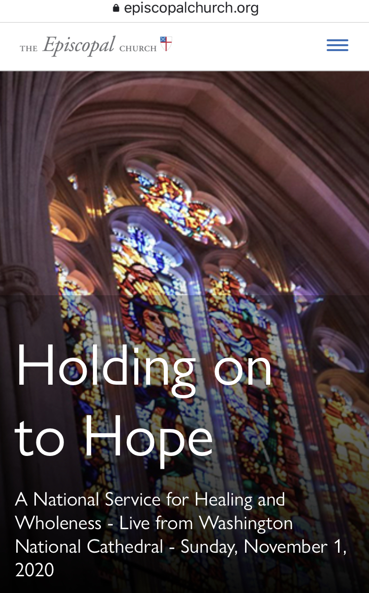 “Presiding Bishop Michael Curry will lead a live-streamed prayer service from Washington National Cathedral, Holding on to Hope: A National Service for Healing and Wholeness, on All Saints Sunday, November 1, at 4:00-5:30 p.m. EST.”