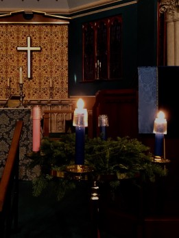 What can you say about the time before a birth (or, say, the New Year)? There’s a lot to do beforehand and anticipation climbs. At St. James, we begin counting down from the first Sunday in Advent. The service is different—we don’t process; we read the Decalogue; the first candle on the Advent wreath is lit. We start planning—we set dates and times, and draft announcements for, the greening of the church, for a Christmas Eve hymn sing and service, and plan refreshments for the reception that will follow.