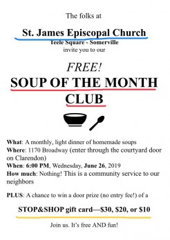 Join us Wednesday, June 26, 6 PM, for a free, light supper of soups. Diners have the chance to win one of THREE Stop & Shop gift cards valued at $10, $20, and $30. No entry fee!